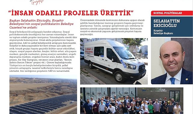 Kırşehir Belediye Başkanı Selahattin Ekicioğlu, CHP Genel Merkezi tarafından dijital olarak yayınlanan Belediye Gazetesi’nde izledikleri sosyal politikayı anlattı.Kırşehir Belediye Başkanı Selahattin Ekicioğlu, CHP Genel Merkezi tarafından yayınlanan Belediye Gazetesi’nin Şubat 2024 tarihli 159. sayısında belediye olarak izledikleri sosyal politikanın ayrıntılarını paylaştı. Başkan Ekicioğlu, şunları kaydetti:"İNSAN VE TOPLUM ODAKLI PROJELER ÜRETİYORUZ"“Sosyal belediyecilik anlayışıyla hareket ediyoruz. Sosyal politikalarımızda önceliğimiz her zaman vatandaşlar. İnsan ve toplum odaklı projeler üretiyoruz. Vatandaşlarla sürekli fikir alışverişinde bulunuyoruz. Ortak akılla projelerimizi hayata geçiriyoruz.Adil ve şeffaf belediyecilik anlayışını benimsedik. Kırşehir’in daha yaşanabilir bir kent olması için çaba sarf ettik, birçok projeyi hayata geçirdik (kültür-sanat etkinlikleri, ulaşım, sosyal yaşam alanları, kreşler, kültür evleri, aile yaşam merkezi, gençlik merkezleri, güneş enerjisi santralleri, engelli dayanışma merkezi, engelsiz hizmet aracı, kadın dostu kent projesi, Kır-Köy Kampüsü, revizyon imar planları, 'Benim Şehrin Benim Fikrim' projesi vb.)."SÖZ VERDİĞİMİZ PROJELERİN YÜZDE 80’İNİ TAMAMLADIK"Göreve başladığımızda Türkiye’nin en borçlu belediyelerinden biriydik, şeffaf yönetim anlayışıyla, tasarruf tedbirleriyle borcu neredeyse sıfırladık. Söz verdiğimiz projelerin yüzde 80’ini tamamladık."İSTİHDAMA VE ÜRETİME YÖNELİK ÇALIŞMALARA AĞIRLIK VERECEĞİZ"Önümüzdeki dönemde kentimizin dokusuna uygun olacak şekilde hazırladığımız tramvay projesini hayata geçirmeyi planlıyoruz. Tarımı, sanayiyi geliştirmek için istihdama ve üretime yönelik çalışmalara ağırlık vereceğiz. Kentimizin sosyal ve ekonomik yapısını geliştirecek projeleri hayata geçireceğiz.”