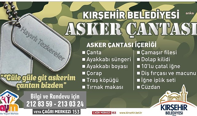 Kırşehir Belediyesi, “Güle Güle Git Askerim, Çantan Bizden” uygulamasıyla askere gidecek gençlere asker çantası vermeye devam ediyor.Milli Savunma Bakanlığı Askeralma Genel Müdürlüğü tarafından askerlik yerlerinin açıklanmasının ardından Kırşehir Belediyesi de vatani görevlerini yapacak gençler için asker çantalarını hazırladı. Kırşehir Belediye Başkanı Selahattin Ekicioğlu, “Hepimiz için asker uğurlama en güzel ve en anlamlı olaylardan biridir. Biz de Kırşehir Belediyesi olarak askere giden Mehmetçiklerimiz için daha önceden başlatmış olduğumuz asker çantası uygulamasına devam ediyoruz. Bu vesileyle tüm Mehmetçiklerimize vatani görevlerinde başarı ve hayırlı tezkereler diliyorum” dedi.Mehmetçiklerin Kırşehir Belediyesi Aile Yaşam Merkezi’ne müracaat etmeleriyle birlikte kendilerine verilecek asker çantası içerisinde ayakkabı süngeri, ayakkabı boyası, çorap, tıraş köpüğü, tırnak makası, çamaşır filesi, dolap kilidi, 10’lu çatal iğne, diş fırçası, diş macunu, iğne iplik seti ve cüzdan bulunuyor.