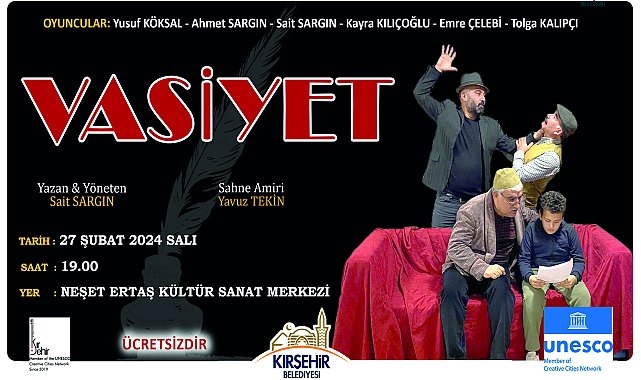 Kırşehir Belediyesi Şehir Tiyatroları, yarın saat 19.00’da Neşet Ertaş Kültür Sanat Merkezi’nde, Sait Sargın’ın yazıp yönettiği “Vasiyet” adlı oyunu sahneleyecek.Kırşehir Belediyesi Şehir Tiyatroları tarafından sahnelenecek “Vasiyet” oyunu, 27 Şubat Salı günü (yarın) Neşet Ertaş Kültür Sanat Merkezi’nde tiyatroseverlerle buluşacak. Vatandaşlar, oyuna ücretsiz katılım sağlayabilecek.Kırşehir Belediye Başkanı Selahattin Ekicioğlu, kentin kültür-sanat alanında gelişimi için birçok projeyi hayata geçirdiklerini belirterek, şunları söyledi:“Yaşamın içindeki acılar, sevinçler, kimi zaman güldüren, kimi zaman ise düşündüren olaylar, sanatçılar tarafından sahnede canlandırılır. İnsan kendini tiyatroda yeniden yaşar. Bir eğitim görevi üstlenen tiyatro, aynı zamanda düşünmemize de vesile olur. Biz, Kırşehir Belediyesi olarak gerek yetişkinler için gerekse de çocuklarımız için hiç ara vermeden tiyatro oyunlarını sahnelemeye devam ediyoruz. Tiyatro yaşamın bir parçasıdır ve hayatı değiştirir. Tüm hemşehrilerimizi ücretsiz olarak sahnelenecek olan oyunumuzu izlemeye bekliyorum.”