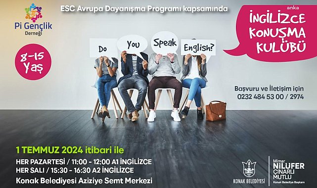 Temmuz ve ağustos ayında her hafta pazartesi ve salı günleri yapılacak çalışmalarda 8-15 yaş grubundaki çocuklar, anadili İngilizce olan gençlerle İngilizce konuşma şansı bulacak. Pazartesi 11.00 - 12.00 saatleri arasında A1 seviyesinde, salı 15.30 - 16.30 saatleri arasında A2 seviyesinde İngilizce konuşma pratiği yapılacak. Ücretsiz olarak düzenlenen İngilizce Konuşma Kulübüne, mesai saatleri içerisinde Konak Belediyesi’nin 0232 484 53 00 numaralı telefonundan 2974 dahili hattan başvuru yaparak ya da etkinlik saatinde Aziziye Mahallesi 576 Sokak No: 3/7 adresindeki Konak Belediyesi Aziziye Semt Merkezi’ne giderek katılım sağlanabiliyor.