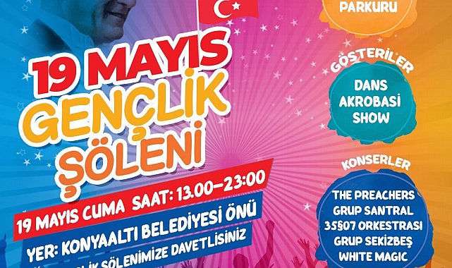 Konyaaltı Belediyesi, her yıl olduğu gibi bu yıl da 19 Mayıs Atatürk’ü Anma Gençlik ve Spor Bayramı’nı hazırladığı bir dizi etkinlikle kutlayacak. Konyaaltı Belediyesi'nin ‘Gençlik Şöleni’ programında, vatandaşlar 19 Mayıs Atatürk’ü Anma, Gençlik ve Spor Bayramı’nı coşkuyla kutlayacak. 19 Mayıs Cuma günü (yarın) saat 13.00’te Belediye Hizmet Binası önünde DJ Performansı ile başlayacak etkinlikler, gün boyunca her yaştan vatandaş için düzenlenecek etkinlik ve konserlerle devam edecek. 19 Mayıs kutlamaları, saat 14.00’te Lb Club Dance Sahne Senin, Show Sotp Dance ve Chi Studio Grup, Antalya Tango Dans Okulu ile devam edecek, saat 15.45’te The Preachers konseriyle 19 Mayıs coşkusu sürecek. Brezilya Dans Gösterisi ve Antalya Sirk Okulu, 35x07 Orkestrası ve Africa Akrobasi Gösterisi performansları da gündüz bölümünde vatandaşla buluşacak.Çocuklar için de etkinliklerin yer alacağı 19 Mayıs Gençlik Şöleni, saat 19.00’da başlayacak Grup Santral konseriyle devam edecek. Saat 19.50’de ise Konyaaltı Belediyesi Halk Oyunları Topluluğu farklı yörelerin kendine has halk oyunlarını izleyenlerle buluşturacak. Saat 20.30’da Grup Sekiz Beş ve saat 21.30’da da White Magic’in sahne alacağı 19 Mayıs etkinlikleri, saat 22.30’daki DJ performansıyla sona erecek. Gazi Mustafa Kemal Atatürk’ün gençlere armağan ettiği 19 Mayıs Atatürk’ü Anma, Gençlik ve Spor Bayramı’nı her yıl olduğu gibi bu yıl da coşkuyla kutlayacaklarını belirten Konyaaltı Belediye Başkanı Semih Esen, “19 Mayıs coşkusunu hep birlikte yaşamak için bütün hemşehrilerimizi etkinliklerimize davet ediyorum’’ dedi.
