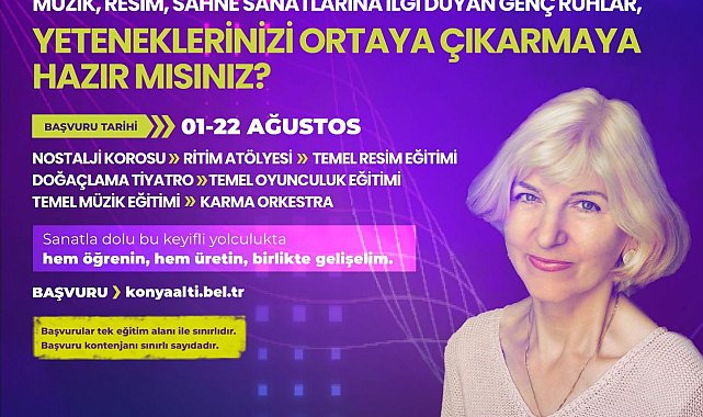 (ANTALYA)- Konyaaltı Belediyesi, elli beş yaş üstü sanatseverler için "Yaşam Boyu Sanat Kursları" düzenliyor. Müzik, resim ve sahne sanatlarına ilgi duyan herkesin katılabileceği kursların başvuruları, 1-22 Ağustos günleri arasında yapılacak.Konyaaltı Belediyesi, her yaştan sanatseveri kurslarla buluşturmaya devam ediyor. Bu kapsamında yeni bir adım atan belediye, elli beş yaş üstü sanatseverler için "Yaşam Boyu Sanat Kursları" düzenleyecek. Yapılan açıklamaya göre kurslarda; nostalji korosu, ritim atölyesi, temel resim eğitimi, doğaçlama tiyatro, temel oyunculuk eğitimi, temel müzik eğitimi, karma orkestra yer alacak.Başvurular 1 Ağustos'ta başlıyor Müzik, resim ve sahne sanatlarına ilgi duyan ve yeteneklerini ortaya çıkarmak isteyen herkesin davet edildiği kursların başvuruları, 1-22 Ağustos günleri arasında yapılacak. Başvurular, 'www.konyaalti.bel.tr' internet adresi üzerinden gerçekleştirilecek. Başvuru yapmak isteyen sanatseverler tek eğitim alanını seçebilecekve başvurular, kontenjanla sınırlı olacak.