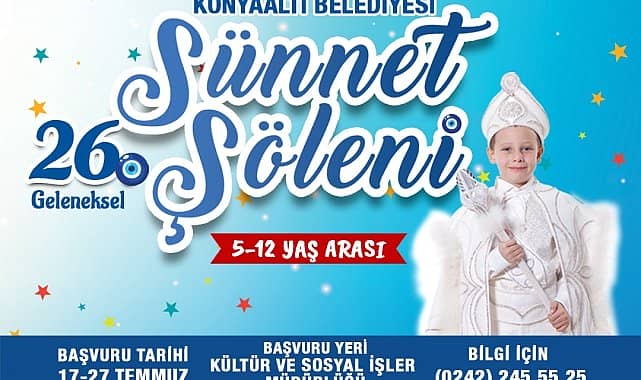 Konyaaltı Belediyesi tarafından her yıl geleneksel olarak düzenlenen Sünnet Şöleni için kayıtlar başladı. Vatandaşlar, 27 Temmuz’a kadar belediyenin Kültür ve Sosyal İşler Müdürlüğü'ne başvuru yapabilecek.Her yıl yüzlerce çocuğun sünnetini üstlenen Konyaaltı Belediyesi, bu yılki sünnet töreni için de kayıtlar almaya başladı. Başvuruların 27 Temmuz’a kadar süreceği bildirilirken, kayıt yapmak isteyen ailelerin Konyaaltı Belediyesi Kültür ve Sosyal İşler Müdürlüğü’ne bizzat gitmesi gerektiği belirtildi.Vatandaşların gerçek ihtiyaçlarına yönelik hizmet verdiklerini belirten Konyaaltı Belediye Başkanı Semih Esen, düzenledikleri Sünnet Şöleni ile ilçedeki çocukları ücretsiz sünnet ettirdiklerini dile getirdi. Başkan Esen, sünnet törenine katılacak çocukları şimdiden tebrik ettiğini söyledi. Bu yıl 26’ncısı yapılacak Sünnet Şöleni’nde 5-12 yaş grubu çocuklar için ailelerin kimlikleriyle birlikte, Konyaaltı Belediyesi Kültür ve Sosyal İşler Müdürlüğüne müracaat etmeleri gerekiyor. Kayıtlar 27 Temmuz’da sona erecek.