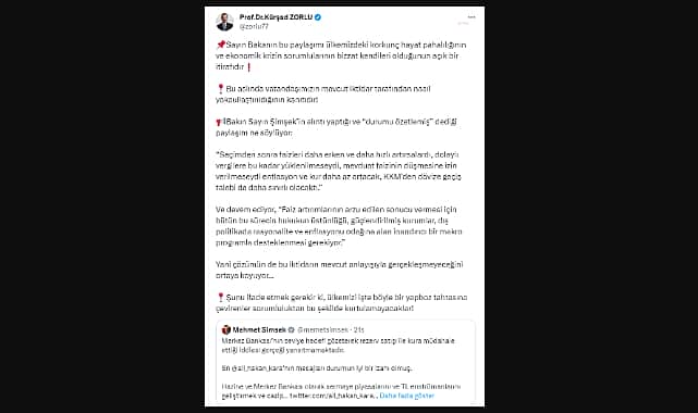 İYİ Parti Sözcüsü ve Ankara Milletvekili Kürşad Zorlu, Hazine ve Maliye Bakanı Mehmet Şimşek’in sosyal medya hesabından yaptığı “Merkez Bankası’nın seviye hedefi gözeterek rezerv satışı ile kura müdahale ettiği iddiası gerçeği yansıtmamaktadır” açıklamasını eleştirdi. Zorlu, konuya ilişkin bugün Twitter hesabından yaptığı açıklamada şu ifadeleri kullandı:“BAKANIN BU PAYLAŞIMI ÜLKEMİZDEKİ EKONOMİK KRİZİN SORUMLULARININ BİZZAT KENDİLERİ OLDUĞUNUN AÇIK BİR İTİRAFIDIR”“Sayın Bakanın bu paylaşımı ülkemizdeki korkunç hayat pahalılığının ve ekonomik krizin sorumlularının bizzat kendileri olduğunun açık bir itirafıdır. Bu aslında vatandaşımızın mevcut iktidar tarafından nasıl yoksullaştırıldığının kanıtıdır. Bakın Sayın Şimşek’in alıntı yaptığı ve ‘durumu özetlemiş’ dediği paylaşım ne söylüyor: ‘Seçimden sonra faizleri daha erken ve daha hızlı artırsalardı, dolaylı vergilere bu kadar yüklenilmeseydi, mevduat faizinin düşmesine izin verilmeseydi enflasyon ve kur daha az artacak, KKM’den dövize geçiş talebi de daha sınırlı olacaktı.’ Ve devam ediyor, ‘Faiz artırımlarının arzu edilen sonucu vermesi için bütün bu sürecin hukukun üstünlüğü, güçlendirilmiş kurumlar, dış politikada rasyonalite ve enflasyonu odağına alan inandırıcı bir makro programla desteklenmesi gerekiyor.’ Yani çözümün de bu iktidarın mevcut anlayışıyla gerçekleşmeyeceğini ortaya koyuyor… Şunu ifade etmek gerekir ki, ülkemizi işte böyle bir yapboz tahtasına çevirenler sorumluluktan bu şekilde kurtulamayacaklar!”Reklam