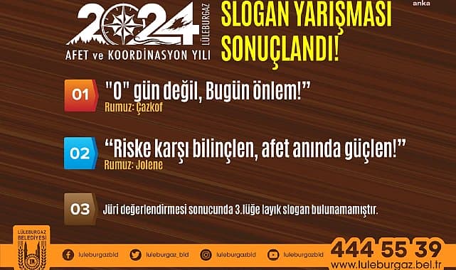Lüleburgaz Belediyesi’nin 2024 Afet ve Koordinasyon Yılı’nın sloganını belirlemek üzere açtığı “Afet ve Koordinasyon Yılı’nı Sen Anlat” isimli slogan yarışması sonuçlandı.9 yaş üzeri herkesin katılabildiği slogan yarışmasına başvurular, 27 Ekim’e kadar alındı. 64 slogan sahibinin başvurduğu yarışmada, 7 kişilik seçici kurulun değerlendirmesi sonucunda yarışmanın kazananı ‘O gün değil, bugün önlem’ sloganı oldu.Yarışmada ikinci seçilen slogan ise ‘Riske karşı bilinçlen, afet anında güçlen’ sloganı oldu.Yarışmada dereceye giren sloganlar için ödül töreni, 2024 Afet ve Koordinasyon Yılı Açılışı’nda yapılacak. Birinci ve ikinci seçilen sloganlar da yıl boyunca kullanılacak.