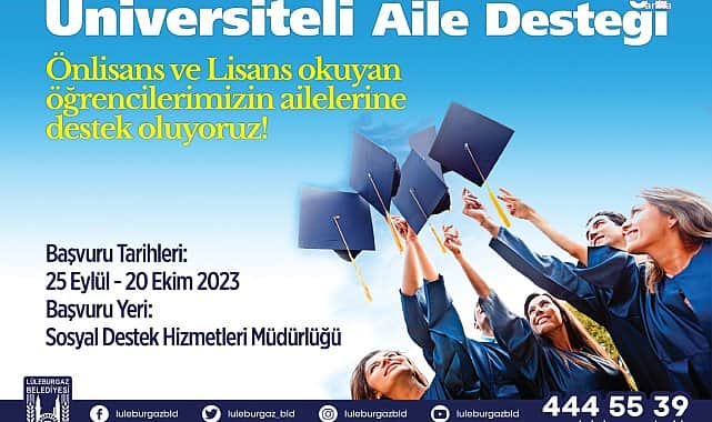 Lüleburgaz Belediyesi'nin üniversiteli öğrencilere Üniversiteli Aile Desteği Programı başvuruları yarın başlatıyor.Tekirdağ Lüleburgaz Belediyesi’nin 2021 yılından bu yana düzenli olarak gerçekleştirdiği Üniversiteli Aile Desteği Programı başvuruları 25 Eylül’de başlıyor. Ön lisans ve lisans programında öğrenim gören öğrenciler istenilen belgelerle birlikte 25 Eylül ile 20 Ekim tarihleri arasında Lüleburgaz Yıldızları Sanat Akademisi’nde yer alan Sosyal Destek Hizmetleri Müdürlüğü’ne başvurabilecek.Lüleburgaz Belediyesi’nin “Başarı sizden destek bizden” sloganıyla 2021 yılında hayata geçirdiği ve bugüne kadar 472 üniversiteli aileye 1 milyon TL’lik destek sağladığı Üniversiteli Aile Desteği Programı Güz Dönemi başvuruları başlıyor. Destek programından faydalanmak isteyen aileler istenilen belgelerle birlikte Lüleburgaz Belediyesi Sosyal Destek Hizmetleri Müdürlüğü’ne başvurabilecek. Sosyal çalışmacılar tarafından titizlikle incelenen başvuruların sonrasında destek programından faydalanmaya hak kazanan ailelere destek ödemesi yapılacak.Başvuruda öğrenci velisinden istenen belgeler:Öğrenci Velisi Kimlik Kartı fotokopisi