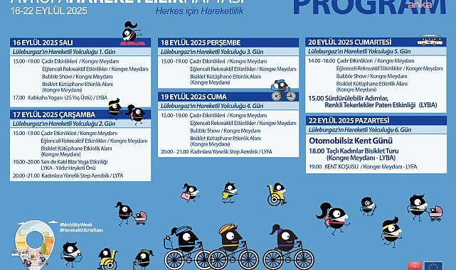 (KIRKLARELİ) - Lüleburgaz Belediyesi, bu yıl "Herkes İçin Hareketlilik" temasıyla 16-22 Eylül günleri arasında kutlanacak Avrupa Hareketlilik Haftası boyunca spor, eğlence ve farkındalık odaklı etkinlikler düzenleyecek.Lüleburgaz Belediyesi, Avrupa Hareketlilik Haftası’nı her yaştan vatandaşın katılabileceği etkinliklerle kutlayacak. Bu yılki teması "Herkes İçin Hareketlilik" olan hafta kapsamında 16-22 Eylül’de çeşitli etkinlikler gerçekleştirilecek. Kongre Meydanı’nda çadır etkinliklerinin yanı sıra LYBA’da "Kahkaha Yogası", LYFA’da kadınlar için step/aerobik, Taçlı Kadınlar Bisiklet Turu ve Kent Koşusu düzenlenecek.Etkinlik programı ise şöyle olacak: -16 Eylül 2025 Salı (bugün)Lüleburgaz’ın Hareketli Yolculuğu 1. GünSaat 15.00-19.00 Çadır Etkinlikleri/Kongre MeydanıRekreaktif Etkinlikler/Kongre MeydanıBubble Show/Kongre MeydanıBisiklet Kütüphane Etkinlik Alanı/Kongre MeydanıSaat 17.00 Kahkaha Yogası (25 yaş üstü)/LYBA-17 Eylül 2025 ÇarşambaLüleburgaz’ın Hareketli Yolculuğu 2. GünSaat 15.00-19.00 arası Çadır Etkinlikleri/Kongre MeydanıRekreaktif Etkinlikler/Kongre MeydanıBisiklet Kütüphane Etkinlik Alanı/Kongre MeydanıSaat 19.00-20.00 arası Sen de Katıl Bize Yoga Etkinliği/LYKA Yıldız Heykel ÖnüSaat 20.00-21.00 arası Kadınlara Yönelik Step Aerobik/LYFA-18 Eylül 2025 PerşembeLüleburgaz’ın Hareketli Yolculuğu 3. Gün15.00-19.00 Çadır Etkinlikleri/Kongre MeydanıRekreaktif Etkinlikler/Kongre MeydanıBisiklet Kütüphane Etkinlik Alanı/Kongre Meydanı-19 Eylül 2025 CumaLüleburgaz’ın Hareketli Yolculuğu 4.GünSaat 15.00-19.00 arası Çadır Etkinlikleri/Kongre MeydanıRekreaktif Etkinlikler/Kongre MeydanıBubble Show/Kongre MeydanıBisiklet Kütüphane Etkinlik Alanı/Kongre MeydanıSaat 20.00-21.00 arası Kadınlara Yönelik Step Aerobik/LYFA-20 Eylül 2025 CumartesiLüleburgaz’ın Hareketli Yolculuğu 5. GünSaat 14.00-18.00 arası Çadır Etkinlikleri/Kongre MeydanıRekreaktif Etkinlikler/Kongre MeydanıBubble Show/Kongre MeydanıBisiklet Kütüphane Etkinlik Alanı/Kongre MeydanıSaat 15.00 Sürdürülebilir Adımlar, Renkli Tekerlekler Paten Etkinliği (LYBA)-22 Eylül Otomobilsiz Kent GünüLüleburgaz’ın Hareketli Yolculuğu 6. GünSaat 18.00 Taçlı Kadınlar Bisiklet Turu/Kongre Meydanı-LYBASaat 19.00 Kent Koşusu/Kongre Meydanı-LYFA
