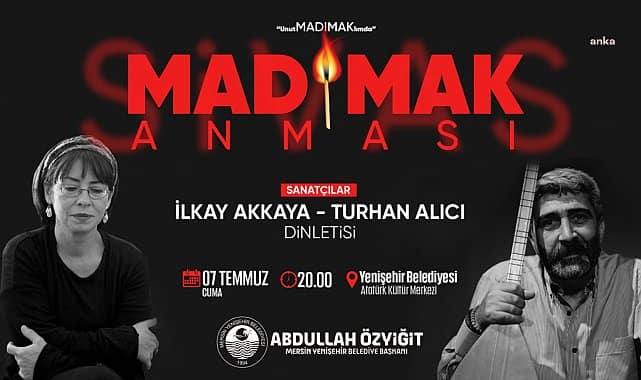 Mersin Yenişehir Belediyesi, Sivas Katliamı'nın 30. yılında anma programı düzenliyor.Anma programı, sanatçılar İlkay Akkaya ve Turhan Alıcı’nın katılımıyla Yenişehir Belediyesi Atatürk Kültür Merkezi'nde 7 Temmuz Cuma günü saat 20.00’de gerçekleştirilecek. İlkay Akkaya ve Turhan Alıcı, türkülerini katliamda yaşamını yitirenlerin anısına seslendirecek.Yenişehir Belediye Başkanı Abdullah Özyiğit ,Madımak Oteli’nde yaşamını yitirenleri anmak amacıyla düzenleyecekleri müzik dinletisine tüm vatandaşları davet etti.