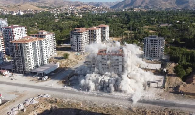 Kahramanmaraş merkezli depremlerde ağır hasar alan binaların yıkım çalışmaları sürüyor. Malatya kent merkezinde iş makinaları binaların yıkım işlemlerini yaparken Yeşilyurt ilçesine bağlı Bostanbaşı Mahallesi’nde yüksek katlı binaların yıkımlarının ise patlayıcıyla yapılmasına karar verilmişti. Bostanbaşı’nda yüksek katlı binaların patlayıcıyla yıkımına başlandı. Mahallede bulunan 12 katlı bina, fünyenin ateşlenmesinin ardından saniyeler içinde yerle bir oldu.