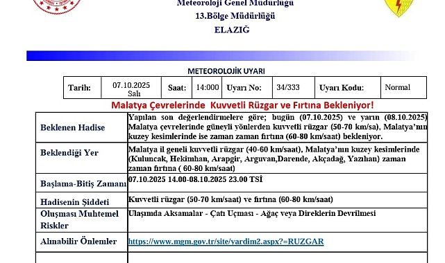 (MALATYA)- Meteoroloji Genel Müdürlüğü, Malatya ve çevrelerinde etkili olması beklenen kuvvetli rüzgar ve fırtına nedeniyle vatandaşları dikkatli olmaları konusunda uyardı.Meteoroloji 13. Bölge Müdürlüğü Bölge Tahmin ve Uyarı Merkezi’nin açıklamasına göre, 7 Ekim Salı günü saat 14.00’ten itibaren 8 Ekim Çarşamba günü saat 23.00’e kadar Malatya genelinde güneyli yönlerden kuvvetli rüzgar (50–70 km/sa) bekleniyor. Malatya’nın kuzey ilçelerinde ise zaman zaman fırtına (60–80 km/sa) etkili olacak.Kuvvetli rüzgar ve fırtınanın özellikle Kuluncak, Hekimhan, Arapgir, Arguvan, Darende, Akçadağ ve Yazıhan ilçelerinde etkili olacağı tahmin ediliyor. Yetkililer, ulaşımda aksamalar, çatı uçması, ağaç ve direk devrilmesi gibi olumsuzluklara karşı vatandaşların dikkatli ve tedbirli olmaları gerektiğini vurguladı.