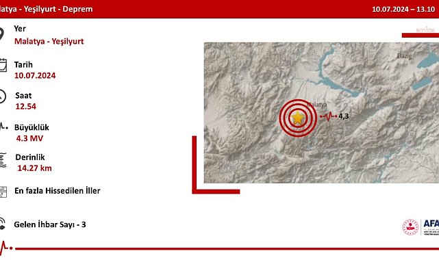 (ANKARA) - Malatya’nın Yeşilyurt ilçesinde, bugün saat 12.54’te, 5 kilometre derinlikte, 4.3 büyüklüğünde deprem oldu.AFAD; Malatya’nın Yeşilyurt ilçesinde, bugün saat 12.54’te, 14.27 kilometre derinlikte, 4.3 büyüklüğünde deprem olduğunu açıkladı. Kandilli Rasathanesi ise büyüklüğünü 4.3 olarak duyurduğu depremin 5 kilometre derinlikte meydana geldiğini bildirdi.Depreme ilişkin resmi X hesabından bilgilendirmede bulunan İçişleri Bakanı Ali Yerlikaya, ''Malatya Yeşilyurt’ta 4.3 büyüklüğünde bir deprem meydana gelmiştir. AFAD ve ilgili kurumlarımızın tüm ekipleri saha taramalarına devam etmektedir. Gelen 3 ihbar incelenmiş olup an itibari ile olumsuz bir durum yoktur. Depremden etkilenen vatandaşlarımıza geçmiş olsun dileklerimi sunuyorum. Allah ülkemizi ve milletimizi afetlerden korusun'' ifadelerini kullandı.