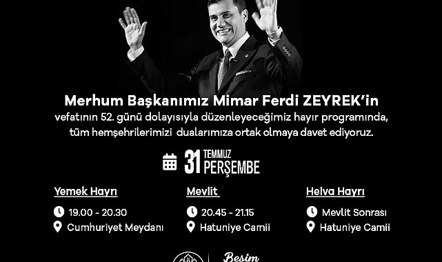 Başkan Dutlulu’dan davetBüyükşehir Belediye Başkanı Besim Dutlulu, tüm Manisalıları anma programına davet ederek, “Görevini her daim, çok sevdiği Manisa ve halkına olan sevgisiyle yerine getiren merhum Manisa Büyükşehir Belediye Başkanı'mız Ferdi Zeyrek’in vefatının 52. gününde, onu dualarla ve sevgiyle anıyoruz. 31 Temmuz Perşembe günü, Cumhuriyet Meydanı'nda düzenleyeceğimiz hayır yemeği ardından Hatuniye Camisi'nde mevlit programı ile merhum Başkan'ımızı dualarla yad edeceğiz. Tüm hemşehrilerimizi Ferdi Başkan’ımız için birlikte dua etmeye davet ediyorum” ifadelerini kullandı.