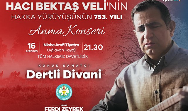 (MANİSA)- Manisa Büyükşehir Belediyesi, Hacı Bektaş Veli anısına konser düzenleyecek. Konserde, UNESCO Yaşayan İnsan Hazinesi Ödüllü Âşık Dertli Divani sahne alacak.Manisa Büyükşehir Belediyesi, Hacı Bektaş Veli’nin barış, sevgi ve hoşgörü temelli felsefesini yaşatmak için anma konseri düzenleyecek. 16 Ağustos Cuma günü saat 21.30’da düzenlenecek özel konser, Niobe Açık Hava Tiyatrosu’nda yapılacak. Konserde, UNESCO’nun ‘Yaşayan İnsan Hazinesi’ seçtiği halk ozanı Âşık Dertli Divani, konuk sanatçı olarak sahne alacak. Sanatçı, Hacı Bektaş felsefesini anlatacak ve türkülerle geceye renk katacak. Büyükşehir Belediyesi’nden yapılan açıklamada, “Tüm halkımızı bu anlamlı gecede bizlerle birlikte olmaya davet ediyoruz. Hacı Bektaş Veli’nin barış, sevgi ve hoşgörüye dayalı felsefesini anmak ve yaşatmak amacıyla 16 Ağustos Cuma günü, saat 21.30’da Niobe Amfi Tiyatro’da buluşalım” denildi.