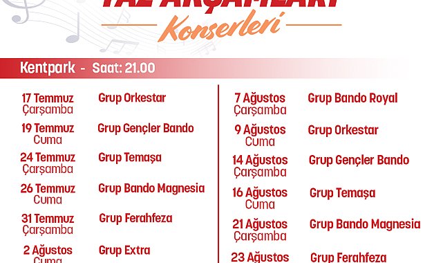 (MANİSA) - Manisa Büyükşehir Belediyesi, yaz akşamlarına renk katmak ve kent sakinlerini müzikle buluşturmak amacıyla “Akustik Yaz Akşamları” konserleri düzenleyecek. Manisa Büyükşehir Belediyesi’nin Akustik Yaz Akşamları konserleri, 17 Temmuz (yarın) ile 23 Ağustos 2024 tarihleri arasında her çarşamba ve cuma gerçekleştirilecek. Atatürk Kent Parkı, Ulupark, Tarzan Meydanı, 15 Temmuz Demokrasi Meydanı, Malta Parkı, Hakkı İplikçi Parkı, Muradiye Meydanı, Cumhuriyet Meydanı ve Bülent Koşmaz Parkı gibi farklı noktalarda düzenlenecek konserlerin tümü saat 21.00'de başlayacak. Manisa Büyükşehir Belediyesi’den yapılan açıklamada, konserlere tüm vatandaşlar davet edilerek, “Tüm halkımızı Akustik Yaz Akşamları konserlerimize davet ediyoruz. Bu özel etkinliklerle yaz akşamlarınıza müzik ve eğlence katmak için sabırsızlanıyoruz” denildi.