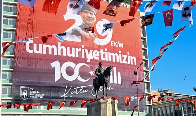 Ankara Büyükşehir Belediye (ABB) Başkanı Mansur Yavaş, Cumhuriyet'in 100'üncü yılında Ankara sokaklarının bayraklarla süslendiği fotoğrafları paylaşarak “Ankara'yı 100. yılımızda kırmızı ve beyaza bürüyoruz. Cumhuriyetin Başkenti hazır” açıklamasını yaptı.ABB Başkanı Mansur Yavaş, Cumhuriyet'in 100'üncü yılında Ankara'daki Ulus Meydanı'nın, Cumhuriyet'in ilan edildiği tarihi Birinci Meclis'in, sokakların ve caddelerin Türkiye'nin kurucusu Gazi Mustafa Kemal Atatürk'ün yer aldığı bayraklarla ve Türk bayrağı ile süslendiği fotoğrafları sosyal medya hesabından paylaştı.Yavaş, X hesabından, “Ankara'yı 100. yılımızda kırmızı ve beyaza bürüyoruz. Cumhuriyetin Başkenti hazır” paylaşımını yaptı.