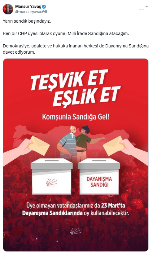 (ANKARA) - Ankara Büyükşehir Belediye (ABB) Başkanı Mansur Yavaş, "Yarın sandık başındayız. Ben bir CHP üyesi olarak oyumu Milli İrade Sandığına atacağım. Demokrasiye, adalete ve hukuka inanan herkesi de Dayanışma Sandığına davet ediyorum" dedi.ABB Başkanı Mansur Yavaş, sosyal medya hesabından, CHP'nin yarın yapılacak ön seçim için vatandaşlara çağrıda bulundu. Yavaş, "Yarın sandık başındayız. Ben bir CHP üyesi olarak oyumu Milli İrade Sandığına atacağım. Demokrasiye, adalete ve hukuka inanan herkesi de Dayanışma Sandığına davet ediyorum" ifadelerini kullandı.