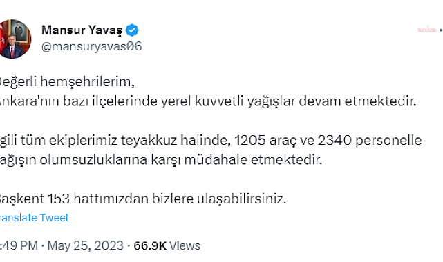 Ankara Büyükşehir Belediye (ABB) Başkanı Mansur Yavaş ve Meteoroloji Genel Müdürlüğü, Ankara’nın bazı ilçelerindeki kuvvetli sağanak yağışa karşı vatandaşları uyardı.ABB Başkanı Mansur Yavaş, resmi Twitter hesabından Ankara’daki hava muhalefetine ilişkin bir paylaşım yaptı. Yavaş’ın açıklaması şöyle:“Değerli hemşehrilerim, Ankara'nın bazı ilçelerinde yerel kuvvetli yağışlar devam etmektedir. İlgili tüm ekiplerimiz teyakkuz halinde, 1205 araç ve 2340 personelle yağışın olumsuzluklarına karşı müdahale etmektedir. Başkent 153 hattımızdan bizlere ulaşabilirsiniz.”Meteoroloji Genel Müdürlüğü’nün Ankara’nın kuzey ve batısına yönelik sağanak yağış uyarısı ise şöyle:“Yapılan son değerlendirmeler ve meteoroloji radarından alınan verilere göre; Ankara'nın kuzey ve batısında gök gürültülü sağanak yağışların akşam saatlerine kadar yerel kuvvetli olması beklendiğinden ani sel, su baskını, yıldırım, yerel dolu yağışı ve yağış anında kuvvetli rüzgâr gibi olumsuzluklara karşı dikkatli ve tedbirli olunması gerekmektedir.”