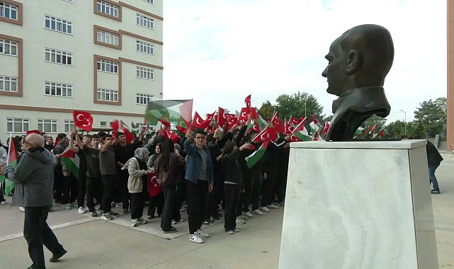 (ANKARA) - Milli Eğitim Bakanı Yusuf Tekin imzası ile 81 ile gönderilen yazı doğrultusunda, tüm okullarda eşzamanlı olarak öğrencilerin katılımıyla Filistin ve Gazze temalı farkındalık etkinlikleri düzenlendi. Ellerinde Türkiye ve Filistin bayrağı taşıyan öğrenciler, "Nehirden denize özgür Filistin" ve "Çocuklar ölürken sessiz kalınmaz" sloganları attı. Etkinlikte öğrencilerden biri ve bir din görevlisi Kur'an ve dualar okudu.Bakanlık tarafından 81 ile gönderilen "Filistin farkındalık etkinlikleri" konulu yazıda, bölgede ve küresel kamuoyunda büyük hassasiyetle takip edilen Filistin meselesi ile Küresel Sumud Filosu gündeminin, eğitim camiasının ortak vicdanını güçlü biçimde temsil etme sorumluluğunu beraberinde getirdiği belirtildi. Gönderilen yazı sonrasında Türkiye genelindeki tüm okullarda farkındalık etkinlikleri düzenlendi.Keçiören'de bulunan Sosyal Bilimler Lisesi’nde düzenlenen etkinlikte öğrenciler, ellerinde Türkiye ve Filistin bayraklarıyla okulun bahçesinde toplandı. Öğrenciler, "Nehirden denize özgür Filistin" ve "Çocuklar ölürken sessiz kalınmaz", "Katil İsrail, Gazze'den defol" sloganları attı. Etkinlik öğrencilerin konferans salonuna alınmasıyla devam etti.Öğrenciler tarafından Filistin'e destek için çizilen resimlerin yer aldığı salonda etkinlik, İstiklal Marşı'nın okunmasıyla başlarken sonrasında bir öğrenci salonda bulunanlara Kur'an okudu. Ardından bir din görevlisi de dua okudu.Etkinlikte Ankara İl Milli Eğitim Müdür Yardımcısı Emrah Tokatlı da bir konuşma yaptı. Tokatlı, "Siyonist İsrail'e karşı tek yumruk olduğumuzu göstermek için bir araya geldik" ifadelerini kullandı. Etkinlik, öğrencilerin şiir okumaları yanı sıra Cumhurbaşkanı Recep Tayyip Erdoğan'ın Birleşmiş Milletler Genel Kurulu’nda Gazze'ye ilişkin yaptığı bir konuşmanın gösterimiyle devam etti.