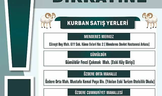 Menderes’te Kurban Bayramı öncesi kurbanlık satışı ve kesim yerleri belli oldu.Kesim yeri olarak tek nokta belirlenirken, dört farklı noktada da kurban satış yerleri hazırlandı. Menderes Belediyesi yaklaşan Kurban Bayramı öncesi hazırlıklarını sürdürürken kurbanlık satış yeri ve kurban kesim noktaları da belli oldu. Kesim yeri olarak tek nokta belirlenirken, dört farklı noktada ise kurban satış yerleri hazırlandı.BAYRAM SONUNA KADAR AÇIK KALACAKMerkez pazaryeri kurban kesim yeri olarak belirlenirken, ilçe genelinde vatandaşların rahat şekilde kurban alışverişlerini gerçekleştirilmesi için Menderes merkezde Menderes Devlet Hastanesi arkası, Gümüldür’de eski köy girişi, Özdere Orta Mahalle’de yıkılan eski turizm otelcilik okulu ve Özdere Cumhuriyet Mahallesi’nde de köy girişinde satış alanı kuruldu.KURBAN MESAİSİKurban bayramı için tüm hazırlıkların sürdüğünü belirten Menderes Belediye Başkan V. Erkan Özkan, "Mübarek Kurban Bayramı öncesinde ilçe genelimizde ki hazırlıklarımız sürüyor. Kurban satış ve kesim yerlerimiz belirlendi. Bayrama kadar gerekli olan tüm çalışmaları ve kontrolleri gerçekleştireceğiz. Bayram süresi boyunca da ekiplerimiz vatandaşlarımızın hizmetinde olacak" dedi.