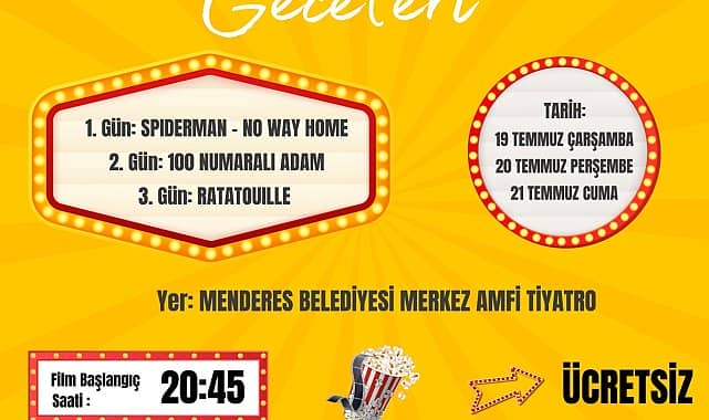 Menderes Belediyesi tarafından ilçe merkezinde '3 Gün 3 Film' açık hava sinema etkinliği düzenlenecek.Menderes Belediyesi Kültür ve Sosyal İşler Müdürlüğü’nün katkıları ve Ege Bil Koleji’nin destekleriyle Kültür Merkezi Amfitiyatro’da '3 Gün 3 Film' sinema etkinliği gerçekleştirilecek.19-21 Temmuz günleri arasında düzenlenecek ücretsiz etkinlik her akşam 20.45’de başlayacak. 19 Temmuz Çarşamba günü Spiderman-No Way Home, 20 Temmuz Perşembe günü 100 Numaralı Adam ve 21 Temmuz Cuma günü Ratatouille filmleri izleyicilerle buluşacak.Kültür etkinliklerine her zaman önem verdiklerini belirten Menderes Belediye Başkanvekili Erkan Özkan, "İlçemiz genelinde gerçekleştirdiğimiz çeşitli kültür etkinlikleriyle vatandaşlarımızın yanında oluyoruz. Bu kapsamda 3 gün boyunca Menderes’te sinema şöleni yaşanacak. Açık hava yaz sineması keyfini çocuklarımız ve ailelerimizle birlikte yaşayacağız. Tüm halkımızı sinema coşkusunu yaşamaya davet ediyorum" dedi.