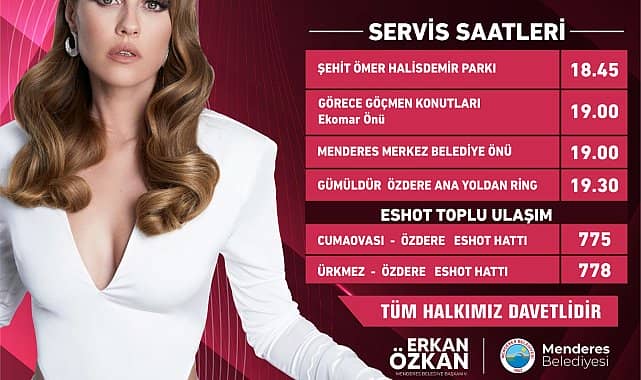 30 Ağustos Zafer Bayramı, Menderes Belediyesi tarafından coşkuyla kutlanacak. Düzenlenecek etkinlikler kapsamında sevilen sanatçı Derya Uluğ Menderesliler'le buluşacak.Menderes Belediyesi tarafından 30 Ağustos Zafer Bayramı’nda Derya Uluğ konseri düzenlenecek. 27 Ağustos Pazar günü saat 21.00’de düzenlenecek konser, Özdere Sedat Balcı stadında gerçekleştirilecek.SERVİS KALDIRILACAKZafer coşkusuna ortak olmak isteyenler için ilçenin farklı noktalarından servis kaldırılacak. Şehit Ömer Halisdemir Parkı önünden saat 18.45’te, Görece Göçmen Konutları Ekomar önü ile belediye binası önünden saat 19.00’de servis kaldırılırken, Gümüldür Özdere yolunda saat 19.30’da ring yapılacak."COŞKUYU BİRLİKTE YAŞAYALIM"Menderes Belediye Başkanvekili Erkan Özkan, "Ulu Önderimiz Gazi Mustafa Kemal Atatürk'ün liderliğinde kazanılan zaferi 101. yılında coşkuyla kutlamak için hazırlıklarımızı tamamladık. Menderes’imizde Cumhuriyet’e giden yolu açan büyük zaferin ruhunu en iyi şekilde yaşayacağız. 27 Ağustos Pazar günü Özdere Sedat Balcı Stad’ında Derya Uluğ konseri ile gerçekleşecek coşkulu zafer kutlamamıza tüm halkımız davetlidir’’ dedi.
