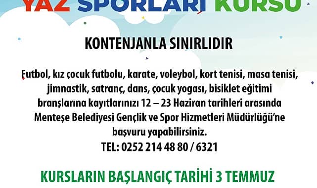 Menteşe Belediyesi'nin yaz sporları kursuna kayıtlar başladı. 5-12 yaş arası çocukların ücretsiz katılım sağlayabileceği yaz sporları kursuna başvurular 23 Haziran’a dek devam edecek.Menteşe’de sağlıklı bireylerin yetişmesi ve çocukların sporla ilgilenmeleri için açılan yaz sporları kursuna kayıtlar başladı. Dans, karate, jimnastik, satranç, çocuk yogası, masa tenisi, kort tenisi, futbol, kız çocuk futbolu, bisiklet eğitimi ve voleybol olmak üzere toplam 11 farklı branşta açılan kurslar, 3 Temmuz 2023 tarihinde başlayacak. Menteşe Belediye Başkanı Bahattin Gümüş, yaz sporları kursu hakkında yaptığı açıklamada şunları kaydetti:“Çocuklarımızın eğitimlerinin yanında sporla da ilgilenmeleri çok önemli. Menteşe Belediyesi olarak, onların sağlıklı birer birey olarak yetişmelerine katkı sağlamak için her yıl ücretsiz yaz sporları kursu açıyor, satrançtan voleybola 11 farklı branşta eğitim almalarını sağlıyoruz. Alanında uzman eğitmenlerimiz tarafından verilen kurslar sayesinde çocuklar hem ilgi duydukları alanda kendilerini geliştiriyor hem de paylaşma, takım ruhu gibi duyguları ediniyorlar. Ayrıca yaptıkları spor sayesinde daha sağlıklı bir beden gelişimi ile mental gelişim gösteriyorlar. Farklı branşlarda yaptıkları spor eğitim hayatlarına da katkı sağlıyor.” Menteşe Belediyesi Gençlik ve Spor Hizmetleri Müdürlüğü’ne yapılacak yaz spor kursları kayıtları ile ilgili Menteşe Belediyesi’nin 0 252 214 48 80 / 6321 numarasından bilgi alınabilecek.