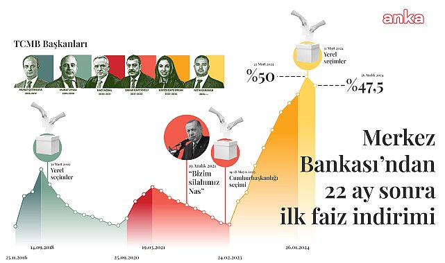 (ANKARA) - Türkiye Cumhuriyeti Merkez Bankası Para Politikası Kurulu, politika faizini 250 baz puan indirerek yüzde 47,5 olarak belirledi. . Geçtiğimiz sekiz ayda ise politika faizi olan bir hafta vadeli repo ihale faiz oranı yüzde 50 düzeyinde sabit tutuldu. Bu kararla 22 ay sonra ilk kez faiz indirimi yapılmış oldu. Kurul toplantısına ilişkin yapılan açıklamada, '' Enflasyon beklentileri ve fiyatlama davranışları iyileşme eğilimi sergilemekle birlikte, dezenflasyon süreci açısından risk unsuru olmaya devam etmektedir. Enflasyonda belirgin ve kalıcı bir bozulma öngörülmesi durumunda para politikası araçları etkili şekilde kullanılacaktır'' denildi.TCMB PPK, aralık ayı politika faizini belirlemek üzere toplandı. Merkez Bankası Başkanı Fatih Karahan'ın başkanlığındaki toplantıda, bir hafta vadeli repo ihale faiz oranı (politika faizi) yüzde 47,5 olarak belirledi.PPK'nın toplantının ardından yapılan açıklamada, operasyonel çerçevede değişikliğe gidildiği belirtilerek, ''Merkez Bankası gecelik vadede borçlanma ve borç verme oranlarının bir hafta vadeli repo ihale faiz oranına kıyasla -/+ 150 baz puanlık bir marj ile belirlenmesine karar vermiştir'' denildi. Açıklamada, şu ifadelere yer verildi:''Enflasyonun ana eğilimi kasım ayında yataya yakın seyretmiştir. Öncü veriler aralık ayında ana eğilimde düşüşe işaret etmektedir. Son çeyreğe ilişkin göstergeler yurt içi talebin yavaşlamayı sürdürerek enflasyondaki düşüşü destekleyici seviyelerde bulunduğunu göstermektedir. Temel mal enflasyonu düşük seyretmeye devam ederken, hizmet enflasyonundaki iyileşme belirginleşmektedir. İşlenmemiş gıda enflasyonu önceki iki aydaki yüksek seyrin ardından aralık ayında ılımlı görünmektedir. Enflasyon beklentileri ve fiyatlama davranışları iyileşme eğilimi sergilemekle birlikte, dezenflasyon süreci açısından risk unsuru olmaya devam etmektedir.''Enflasyon beklentileri öngörülen tahmin aralığına yakınsayana kadar sıkı para politikası duruşu sürdürülecektir''Para politikasındaki kararlı duruş; yurt içi talepte dengelenme, Türk lirasında reel değerlenme ve enflasyon beklentilerinde düzelme vasıtası ile aylık enflasyonun ana eğilimini düşürmekte ve dezenflasyon sürecini güçlendirmektedir. Maliye politikasının artan eşgüdümü de bu sürece önemli katkı sağlayacaktır. Aylık enflasyonun ana eğiliminde belirgin ve kalıcı bir düşüş sağlanana ve enflasyon beklentileri öngörülen tahmin aralığına yakınsayana kadar sıkı para politikası duruşu sürdürülecektir.Bu doğrultuda, politika faizinin seviyesi, enflasyon gerçekleşmeleri ve beklentileri göz önünde bulundurularak öngörülen dezenflasyon sürecinin gerektirdiği sıkılığı sağlayacak şekilde belirlenecektir. Kurul, kararlarını enflasyon görünümü odaklı, ihtiyatlı ve toplantı bazlı bir yaklaşımla alacaktır. Enflasyonda belirgin ve kalıcı bir bozulma öngörülmesi durumunda para politikası araçları etkili şekilde kullanılacaktır.Kredi ve mevduat piyasalarında öngörülenin dışında gelişmeler olması durumunda parasal aktarım mekanizması ilave makroihtiyati adımlarla desteklenecektir. Likidite koşulları muhtemel gelişmeler göz önünde bulundurularak yakından izlenmektedir. Sterilizasyon araçları etkili şekilde kullanılmaya devam edilecektir.Kurul, politika kararlarını parasal sıkılaştırmanın gecikmeli etkilerini de dikkate alarak, enflasyonun ana eğilimini geriletecek ve enflasyonu orta vadede yüzde 5 hedefine ulaştıracak parasal ve finansal koşulları sağlayacak şekilde belirleyecektir.Enflasyon ve enflasyonun ana eğilimine ilişkin göstergeler yakından takip edilecek ve Kurul, fiyat istikrarı temel amacı doğrultusunda elindeki tüm araçları kararlılıkla kullanacaktır.Kurul, kararlarını öngörülebilir, veri odaklı ve şeffaf bir çerçevede alacaktır.''22 ay sonra ilk faiz indirimi Merkez Bankası, bu yılın ocak ayında politika faizi olan bir hafta vadeli repo ihale faiz oranı yüzde 42,5’ten yüzde 45’e yükseltti. Şubat ayında, politika faizi olan bir hafta vadeli repo ihale faiz oranı yüzde 45 düzeyinde sabit tutuldu. Mart ayında, politika faizi olan bir hafta vadeli repo ihale faiz oranı yüzde 45’ten yüzde 50’ye yükseltildi. Geçtiğimiz sekiz ayda ise politika faizi olan bir hafta vadeli repo ihale faiz oranı yüzde 50 düzeyinde sabit tutuldu. Bu kararla 22 ay sonra ilk kez faiz indirimi yapılmış oldu.Merkez Bankası'nın faiz indiriminin ardından döviz kurlarında sınırlı düzeyde yukarı yönlü hareket yaşandı. İstanbul Borsası'nda ise çok az düşüş yaşandı.(Son)