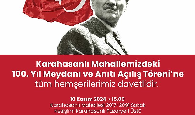 (DENİZLİ)- Merkezefendi Belediyesi, Karahasanlı Mahallesi’nde 100. Yıl Meydanı ve Anıtı'nı törenle açacak.Merkezefendi Belediyesi, Cumhuriyet'in ilanının 101. yılına özel olarak hazırlanan 100. Yıl Meydanı ve Anıtı’nın açılış törenini, Karahasanlı Mahallesi’nde düzenleyecek. Türk Havacılık ve Uzay Sanayii AŞ. (TUSAŞ) Ankara Kahramankazan tesislerine yönelik terör saldırısından dolayı ertelenen açılış, 10 Kasım Pazar günü saat 15.00’te Karahasanlı Mahallesi 2017-2091 Sokak kesişimi Karahasan Pazaryeri üstünde yapılacak.Açılış, Belediye Başkanı Şeniz Doğan ve birçok vatandaşın katılımıyla gerçekleştirilecek.