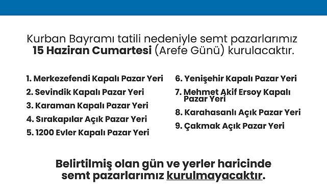 (DENİZLİ) - Merkezefendi Belediyesi, Kurban Bayramı dolayısıyla Arife Günü kurulacak semt pazarlarının yerini duyurdu.Merkezefendi Belediyesi, Kurban Bayramı tatili dolayısıyla 15 Haziran Cumartesi günü kurulacak pazar yerlerini açıkladı. Belirlenen gün ve yerler dışında semt pazarı kurulmayacak, değişiklik sadece bu hafta için geçerli olacak.Belediye tarafından açıklanan pazar yerleri ise şöyle:Merkezefendi Kapalı Pazar Yeri, Sevindik Kapalı Pazar Yeri, Karaman Kapalı Pazar Yeri, Sırakapılar Açık Pazar Yeri, 1200 Evler Kapalı Pazar Yeri, Yenişehir Kapalı Pazar Yeri, Mehmet Akif Ersoy Kapalı Pazar Yeri, Karahasanlı Açık Pazar Yeri ve Çakmak Açık Pazar Yeri.