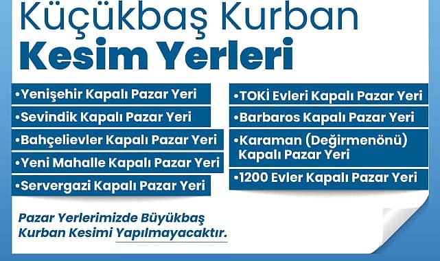 Merkezefendi Belediyesi, Kurban Bayramı’nda ilçe genelinde hizmet verilecek kurban kesim yerlerini açıkladı. Merkezefendi Belediye Başkanı Şeniz Doğan, “İlçemizde bayramın mutlu, sağlıklı ve huzurlu bir şekilde geçmesi için tüm önlemleri alıyoruz” dedi.Merkezefendi’de, 28 Haziran Çarşamba günü başlayacak Kurban Bayramı hazırlıkları çerçevesinde kurban kesim yerlerini belirlendi. Yenişehir Kapalı Pazar Yeri, Sevindik Kapalı Pazar Yeri, Bahçelievler Kapalı Pazar Yeri, Yeni Mahalle Kapalı Pazar Yeri, Servergazi Kapalı Pazar Yeri, TOKİ Evleri Kapalı Pazar Yeri, Barbaros Kapalı Pazar Yeri, Karaman (Değirmenönü) Kapalı Pazar Yeri ve 1200 Evler Kapalı Pazar Yerlerinde küçükbaş kurban kesimi yapılacak. Belirlenen noktalarda vatandaşın daha sağlıklı ve temiz bir ortamda kurban kesim işlemlerini gerçekleştirebilmesi için tüm önlemler alındı. Kurban kesim alanlarında kasap, zabıta ekipleri ve görevli personel hazır bulunacak. Ekipler, hijyen kurallarına uyulması konusunda vatandaşlara yardımcı olacak. Kesim işlemlerinin sona ermesinin ardından Çevre Koruma ve Kontrol Müdürlüğü ekipleri, kesim alanlarında temizlik işlemini yapacak. Fen İşleri Müdürlüğü, Kültür Müdürlüğü, Zabıta Müdürlüğü, Park ve Bahçeler Müdürlüğü, Çevre Koruma ve Kontrol Müdürlüğü ile Çağrı Merkezi ekipleri Kurban Bayramı boyunca görevlerinin başında olacak.“BAYRAMDA 24 SAAT GÖREV BAŞINDA OLACAĞIZ”Kurban Bayramı hazırlıklarını titizlikle tamamladıklarını belirten Başkan Doğan, “Hemşehrilerimizin sağlıklı ve hijyenik koşullarda kurallara uygun şekilde kesimlerini yapabilmeleri için tüm düzenlemeleri yaptık. Görevli çalışma arkadaşlarımız hemşehrilerimizin işlerini kolaylaştırmak için belirlediğimiz kurban kesim yerlerinde bulunacak. İlçemizde bayramın mutlu, sağlıklı ve huzurlu bir şekilde geçmesi için gereken her şeyi yapıyoruz. Merkezefendili hemşehrilerimizin bayramı ağız tadıyla yaşaması için 24 saat görev başında olacağız” dedi.