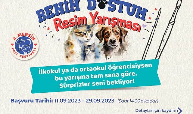 Mersin Büyükşehir Belediyesi, bu yıl 4. kez düzenleyeceği Patifest’e özel ‘Benim Dostum’ resim yarışması düzenliyor. İlkokul ve ortaokul öğrencilerinin, patili dostlara olan sevgisinin ana tema olduğu yarışmada dereceye giren ilk 3 öğrenci ödüllendirilecek. Ödüller 8 Ekim Pazar günü yapılacak Patifest’te verilecek. Ayrıca ilk 10’a giren resimler, Patifest alanında sergilenecek.