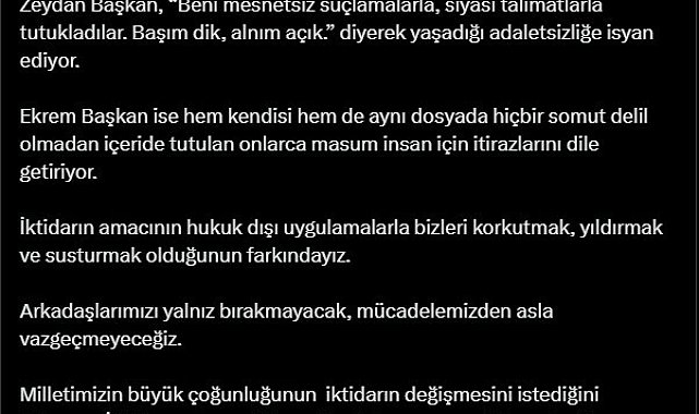 (ANKARA)-Silivri Cezaevi’nde tutuklu bulunan Zeydan Karalar ve Ekrem İmamoğlu’nu ziyaret eden Mersin Büyükşehir Belediye Başkanı Vahap Seçer, Karalar ve İmamoğlu’nun mesajını paylaştı. Seçer, "Zeydan Başkan, ‘Beni mesnetsiz suçlamalarla, siyasi talimatlarla tutukladılar. Başım dik, alnım açık.’ diyerek yaşadığı adaletsizliğe isyan ediyor. Ekrem Başkan ise hem kendisi hem de aynı dosyada hiçbir somut delil olmadan içeride tutulan onlarca masum insan için itirazlarını dile getiriyor. İktidarın amacının hukuk dışı uygulamalarla bizleri korkutmak, yıldırmak ve susturmak olduğunun farkındayız" dedi.Mersin Büyükşehir Belediye Başkanı Vahap Seçer Silivri Cezaevi’nde tutuklu bulunan İstanbul Büyükşehir Belediye(İBB)Başkanı ve CHP’nin Cumhurbaşkanı adayı Ekrem İmamoğlu ve Adana Büyükşehir Belediye Başkanı Zeydan Karalar’ı ziyaret etti. Ziyarete ilişkin sosyal medya hesabı üzerinden açıklama yapan Seçer, şu ifadeleri kullandı:"Silivri Cezaevi’nde yol arkadaşlarımız Zeydan ve Ekrem Başkanları ziyaret ettim. Her ikisinin de morali yüksek, halkına güveni tam ve tüm yurttaşlarımıza selamları var. Zeydan Başkan, 'Beni mesnetsiz suçlamalarla, siyasi talimatlarla tutukladılar. Başım dik, alnım açık.' diyerek yaşadığı adaletsizliğe isyan ediyor. Ekrem Başkan ise hem kendisi hem de aynı dosyada hiçbir somut delil olmadan içeride tutulan onlarca masum insan için itirazlarını dile getiriyor.İktidarın amacının hukuk dışı uygulamalarla bizleri korkutmak, yıldırmak ve susturmak olduğunun farkındayız. Arkadaşlarımızı yalnız bırakmayacak, mücadelemizden asla vazgeçmeyeceğiz. Milletimizin büyük çoğunluğunun iktidarın değişmesini istediğini biliyoruz. İktidarın gün geçtikçe artan telaşının ve antidemokratik uygulamaların sebebi de bu zaten. Halkımızın bize verdiği görevi eksiksiz yerine getirirken, partimizin ve arkadaşlarımızın hukukunu da sonuna kadar koruyacağız. Milletimizin desteğiyle kazanan mutlaka biz olacağız."