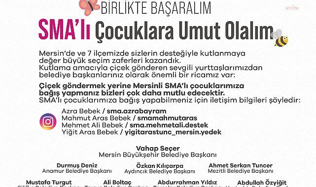 Mersin Büyükşehir Belediye Başkanlığı’na yeniden seçilen Vahap Seçer ile CHP’li 7 İlçe Belediye Başkanı, seçim sonuçlarını tebrik için çiçek yollamak isteyen yurttaşlara, “SMA’lı bebeklere bağış” çağrısı yaptı.Başkan Seçer, kendisini tebrik için çiçek yollamak isteyenleri, SMA hastası çocuklara bağış yapmaya çağırdı. Başkan Seçer’in çağrısına, CHP’li İlçe Belediye Başkanları da destek verdi. Mersin’de yaşayan ve SMA hastalığıyla mücadele eden Azra, Mahmut Aras, Mehmet Ali ve Yiğit Aras bebekler için yapılan çağrıya Anamur Belediye Başkanı Durmuş Deniz, Aydıncık Belediye Başkanı Özkan Kılıçarpa, Mezitli Belediye Başkanı Ahmet Serkan Tuncer, Silifke Belediye Başkanı Mustafa Turgut, Tarsus Belediye Başkanı Ali Boltaç, Toroslar Belediye Başkanı Abdurrahman Yıldız ve Yenişehir Belediye Başkanı Abdullah Özyiğit destek verdi.Başkan Seçer ve CHP’li başkanların imzasıyla yayımlanan ‘Birlikte Başaralım, SMA’lı Çocuklara Umut Olalım’ başlıklı çağrıda, şunlara yer verildi:“Mersin’de ve 7 ilçemizde sizlerin desteğiyle, kutlanmaya değer büyük seçim zaferleri kazandık. Kutlama amacıyla çiçek gönderen sevgili yurttaşlarımızdan, belediye başkanlarınız olarak önemli bir ricamız var. Çiçek göndermek yerine Mersinli SMA’lı çocuklarımıza bağış yapmanız, bizleri çok daha mutlu edecektir. SMA’lı çocuklarımıza bağış yapabilmeniz için iletişim bilgileri şöyledir: Azra Bebek / sma.azrabayramMahmut Aras Bebek / smamahmutarasMehmet Ali Bebek / sma.mehmetali.destekYiğit Aras Bebek / yigitarastunc_mersin.yedek”