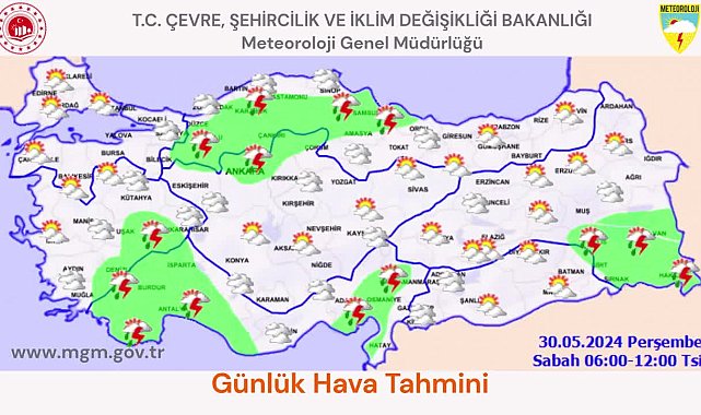 (ANKARA) -Meteoroloji Genel Müdürlüğü (MGM) verilerine göre, bugün Isparta'nın batısı, Burdur'un doğusu ile Antalya'nın batısının iç kesimleri, Ankara, Çankırı, Kırıkkale, Bolu'nun doğusu, Karabük, Kastamonu, Çorum, Amasya ve Tokat'ın batısında yerel kuvvetli yağış bekleniyor.MGM'nin yaptığı son değerlendirmelere göre, İç Ege, Akdeniz, İç Anadolu (Sivas ve Karaman dışında), Batı ve Doğu Karadeniz'in iç kesimleri, Orta Karadeniz, Doğu Anadolu'nun doğusu ile Bilecik, Sinop ve Erzincan çevrelerinin yerel sağanak ve gök gürültülü sağanak yağışlı geçeceği tahmin ediliyor.MGM, bugün öğle saatlerinden itibaren yerel kuvvetli gök gürültülü sağanak yağış beklendiğinden sel, su baskını, yıldırım, ulaşımda aksamalar, yağış anında kuvvetli rüzgar ve yerel dolu yağışı gibi olumsuzluklara karşı vatandaşları uyardı.
