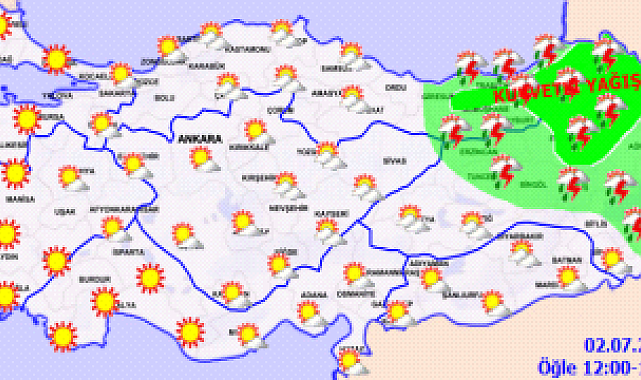 (ANKARA) - Meteoroloji Genel Müdürlüğü'nün (MGM) verilerine göre; bugün Artvin, Erzurum, Kars, Ardahan, Ordu, Giresun çevreleriyle Trabzon ve Rize'nin iç kesimlerinde yerel olmak üzere kuvvetli yağış bekleniyor.MGM'nin son verilerine göre Doğu Karadeniz, Doğu Anadolu'nun kuzeyi ve doğusu ile Ordu çevrelerinin yerel olmak üzere sağanak ve gök gürültülü sağanak yağışlı olması bekleniyor. Yağışların, Artvin, Erzurum, Kars, Ardahan, Ordu, Giresun çevreleriyle Trabzon ve Rize'nin iç kesimlerinde yerel olmak üzere kuvvetli olacağı tahmin ediliyor.MGM, sel, su baskını, yıldırım, yerel dolu yağışı, heyelan, yağış anında kuvvetli rüzgar ve ulaşımda aksamalara karşı vatandaşları uyardı.