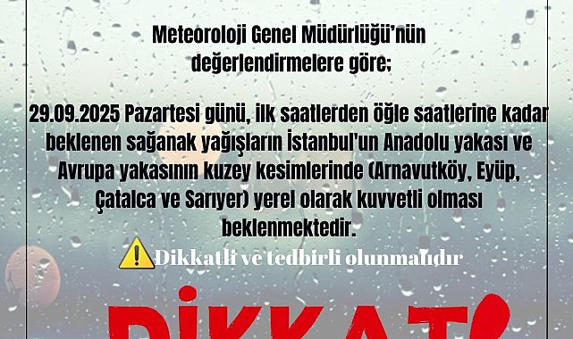(İSTANBUL) - Meteoroloji Genel Müdürlüğü’ne göre, yarının ilk saatlerden öğle saatlerine kadar beklenen sağanak, Arnavutköy, Eyüpsultan, Çatalca ve Sarıyer ilçelerinde etkili olacak. İstanbul Valiliği, yağışlara karşı dikkatli ve tedbirli olunması uyarısı yaptı.Meteoroloji Genel Müdürlüğü’nün değerlendirmelerine göre, yarının ilk saatlerden öğle saatlerine kadar beklenen kuvvetli sağanak yağışlar bekleniyor.İstanbul’un Anadolu ve Avrupa yakasının kuzey kesimlerinde olmak üzere özellikle Arnavutköy, Eyüpsultan, Çatalca ve Sarıyer ilçelerinde kuvvetli olması beklenirken sel, su baskını, heyelan ve ulaşımda aksama uyarısı yapıldı.İstanbul Valiliği de dikkatli ve tedbirli olunması uyarısı yaptı.