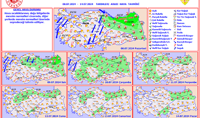 (ANKARA) - Meteoroloji Genel Müdürlüğü (MGM), önümüzdeki hafta boyunca hava sıcaklıklarının doğu bölgeleri hariç tüm bölgelerde mevsim normalleri üzerinde seyredeceğini bildirdi. Yarın için 4 ilde kuvvetli yağış uyarısı yapıldı. MGM, haftalık hava tahmin raporunu yayımladı. Son verilere göre hava sıcaklıkları doğu bölgelerde mevsim normalleri civarında, diğer bölgelerde ise mevsim normallerinin üzerinde seyretmeye devam edecek.Bu gece saatlerinden itibaren Trabzon ve Giresun'da, yarın sabah saatlerinden itibaren ise Samsun'un doğusunda yerel kuvvetli, Ordu çevrelerinde çok kuvvetli sağanak ve gök gürültülü sağanak yağış bekleniyor.Meteoroloji, kuvvetli sağanak nedeniyle yaşanabilecek olumsuzluklara karşı vatandaşları uyardı.
