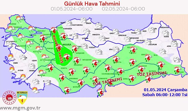 (ANKARA)- Meteoroloji Genel Müdürlüğü'nün (MGM) yaptığı son değerlendirmelere göre, bugün Marmara'nın kuzey ve doğusu, Batı Akdeniz’in iç kesimleri, Doğu Akdeniz, İç Anadolu, Karadeniz, Doğu ve Güneydoğu Anadolu bölgeleri ile Çanakkale'nin doğusunun sağanak ve gök gürültülü sağanak yağışlı geçeceği tahmin ediliyor.MGM verilerine göre, yağışların; Doğu Akdeniz, Orta Akdeniz'in iç kesimleri, İç Anadolu, Batı Karadeniz, Orta Karadeniz'in iç kesimleri ile Gaziantep, Kilis ve Adıyaman çevrelerinde yer yer kuvvetli olması bekleniyor.MGM tarafından paylaşılan verilere göre, yurt genelinin parçalı, yer yer çok bulutlu, Marmara'nın kuzey ve doğusu, Batı Akdeniz’in iç kesimleri, Doğu Akdeniz, İç Anadolu, Karadeniz, Doğu ve Güneydoğu Anadolu bölgeleri ile Çanakkale'nin doğusu, Kütahya, Afyonkarahisar ve Denizli'nin doğu çevrelerinin yerel olmak üzere sağanak ve gök gürültülü sağanak yağışlı geçeceği tahmin ediliyor. Ayrıca Doğu Akdeniz'in doğusu ile Güneydoğu Anadolu’da toz taşınımı tahmin ediliyor.METEOROLOJİ GENEL MÜDÜRLÜĞÜ, VATANDAŞLARI UYARDIMGM, yağışlar nedeniyle yaşanabilecek sel, su baskını, yıldırım, yerel dolu yağışı, yağış anında kuvvetli rüzgar gibi olumsuzluklara karşı vatandaşları uyardı. Ayrıca Doğu Akdeniz'in doğusu ile Güneydoğu Anadolu’da toz taşınımı beklendiğinden, görüş mesafesinde düşme, hava kalitesinde azalma ve ulaşımda aksamalar gibi olumsuzluklara karşı da dikkatli olunması gerektiğini bildirdi.