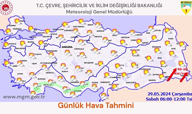 (ANKARA) -Meteoroloji Genel Müdürlüğü'nün (MGM) yaptığı son değerlendirmelere göre, bugün Trakya kesimi, Batı Akdeniz'in iç kesimleri ile Toroslar mevki, Eskişehir dışında İç Anadolu, Orta Karadeniz, Kastamonu, Artvin, Ardahan, Kars ve Hakkari çevreleri ile Rize ve Trabzon'un iç kesimlerinde yerel sağanak ve gök gürültülü sağanak yağış bekleniyor.MGM verilerine göre, yurt genelinin parçalı yer yer çok bulutlu olacağı, hava sıcaklıklarının ise batı ve iç kesimlerde mevsim normalleri civarında, doğu kesimlerde ise normallerinin üzerinde seyredeceği tahmin ediliyor.MGM, rüzgarın Doğu Anadolu ile Güneydoğu Anadolu’nun doğusunda güneyli yönlerden kuvvetli olarak esmesi beklendiğinden yaşanabilecek olumsuzluklara karşı vatandaşları uyardı.
