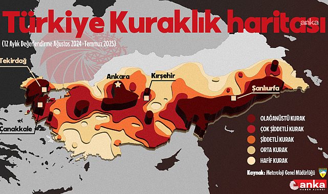 (ANKARA) - Meteoroloji Genel Müdürlüğü’nün (MGM) son 12 ayı kapsayan kuraklık haritası, Türkiye'nin büyük bölümünde şiddetli kuraklığın etkili olduğunu ortaya koydu.MGM, Ağustos 2024 – Temmuz 2025 dönemini kapsayan 12 aylık meteorolojik kuraklık haritasını yayımladı. Haritaya göre, Türkiye’nin büyük bölümünde ''şiddetli ve olağanüstü kuraklık'' yaşanırken, yalnızca Karadeniz’in doğusu ile bazı sınırlı bölgelerde nemli ve normal değerler kaydedildi.Harita, İç Anadolu Bölgesi’nin neredeyse tamamını "olağanüstü çok şiddetli kurak" ve "aşırı kurak" olarak gösteriyor. Konya, Aksaray, Niğde, Nevşehir, Kayseri’nin büyük bölümü, Yozgat, Kırıkkale ve Ankara çevresinde kuraklığın en yüksek seviyede olduğu kaydedildi.Ege’nin iç kesimleri, Manisa, Uşak, Afyonkarahisar, Kütahya ve Denizli çevreleri de benzer şekilde aşırı kuraklık yaşayan iller arasında yer aldı. Aynı şekilde Akdeniz’in iç kesimlerinde Isparta, Burdur ve Antalya’nın kuzeydoğusu da kuraklığın en yoğun hissedildiği bölgelerden biri oldu.Kuraklık haritasında bölgesel dağılım