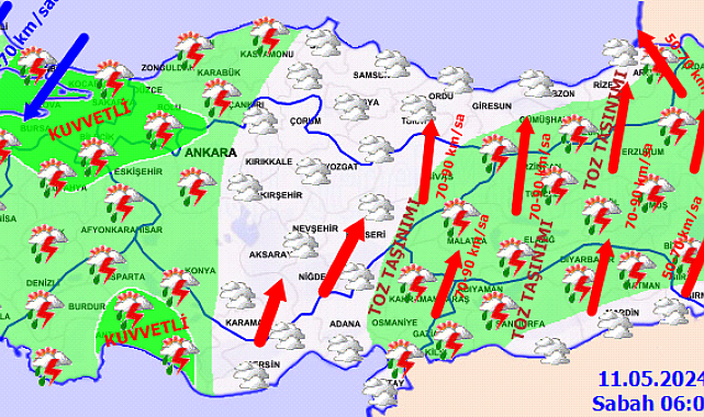 (ANKARA)- Meteoroloji Genel Müdürlüğü'nün (MGM) değerlendirmelerine göre, Marmara’nın doğusu, İç Anadolu’nun kuzeyi, Batı ve Orta Karadeniz’in iç kesimleri, Doğu Anadolu’nun kuzey ve batısı ile Antalya çevrelerinde kuvvetli yağış bekleniyor.MGM verilerine göre, yağışlı hava ile birlikte batı kesimlerinde sıcaklığın 4 ila 6 derece düşeceği tahmin ediliyor.Rüzgarın, Marmara ve Kıyı Ege'de kuzey yönlerden kuvvetli İç Anadolu’nun güney ve doğusu, Orta ve Doğu Karadeniz'in iç kesimleri ile Doğu Anadolu’da güney yönlerden kuvvetli ve kısa süreli fırtına şeklinde esmesi bekleniyor.Marmara’nın doğusu, İç Anadolu’nun kuzeyi, Batı ve Orta Karadeniz’in iç kesimleri, Doğu Anadolu’nun kuzey ve batısı ile Antalya çevrelerinde kuvvetli yağış bekleniyor.