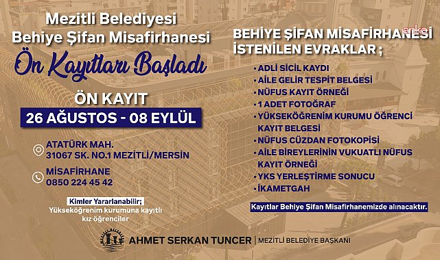 (MERSİN) - Mezitli Belediye Başkanı Ahmet Serkan Tuncer, Behiye Şifan Misafirhanesi’nin 2025-2026 akademik yılına hazır olduğunu belirterek, ön kayıtların başladığını duyurdu.Mezitli Belediyesi’nin Atatürk Mahallesi Üniversite Caddesi’nde yer alan Behiye Şifan Misafirhanesi, kadın öğrencilerin güvenli, rahat ve ekonomik bir ortamda barınabilmeleri için hizmet vermeye devam ediyor.Ön kayıt başvuruları, 26 Ağustos ile 8 Eylül 2025 tarihleri arasında Behiye Şifan Misafirhanesi’nde yapılabilecek. Başvuruların tamamlanmasının ardından gerekli değerlendirmeler gerçekleştirilecek ve uygun görülen öğrencilere bilgi verilecek.Yurt başvurusu için öğrencilerden; adli sicil kaydı, aile gelir tespit belgesi, aile bireylerinin vukuatlı nüfus kayıt örneği, ikametgah belgesi, nüfus kayıt örneği, bir adet fotoğraf, yükseköğrenim kurumu öğrenci kayıt belgesi, YKS yerleştirme sonuç belgesi ve nüfus cüzdanı fotokopisi istenecek. Başvurular bu belgeler ile birlikte misafirhaneye teslim edilecek.Başkan Tuncer, “Mersin’e okumak için gelen kız öğrencilerimizin barınma ihtiyacını karşılamaya katkı sunmak bizim için büyük bir sorumluluk. Anadolu’nun dört bir yanından gelen gençlerimiz yalnızca ailelerinin değil, aynı zamanda Cumhuriyetimizin de bize emaneti. Onların güvenli, huzurlu ve başarılı bir eğitim hayatı geçirmesi için her zaman yanlarında olacağız” diye konuştu.