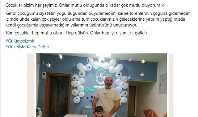 İzmit'te Tüysüzler Çınar Çocuk Evi’nde eğitim alan minik Armağan’ın babası, İzmit Belediye Başkanı Fatma Kaplan Hürriyet’e teşekkür mesajı gönderdi. Kurumda eğitim almaya başladığı andan itibaren oğlunun tam bir okul sevdalısı haline geldiğini ifade eden baba, “Sizler hayatımıza dokundunuz ve bu kurumun kalitesinden dolayı son dereceye gururluyuz” dedi.Çocukların eğitimini ve geleceğini önemseyen İzmit Belediyesi Çınar Çocuk Evleri, hem çocukların hem de velilerin beğenisini kazanmaya devam ediyor. Tüysüzler Çınar Çocuk Evi öğrencilerinden minik Armağan’ın babası kurumdan duyduğu memnuniyeti İzmit Belediye Başkanı Fatma Kaplan Hürriyet’e attığı mesajla ifade etti. “ÇOCUĞUMUZ OKUL SEVDALISI OLDU”Armağan’ın babası mesajında şu ifadelere yer verdi:“Özel anaokulunda uyumlanamayan oğlum Armağan’ı Çınar Çocuk Evi Tüysüzler’e kayıt ettirdik. İlk günden beri şefkatle, sabırla ve öğretmenlerimizin üstün ilgisiyle oğlumuz tam bir okul sevdalısı haline geldi. Belediyemize güvenmenin bir kez daha haklılığını yaşadık sayenizde. Bugün ne kadar iyi bir tercih yaptığımızı bir kez daha anlamış olduk. Sizler hayatımıza dokundunuz ve bir partiliniz olarak bu kurumun kalitesinden dolayı son dereceye gururluyuz”HÜRRİYET, “ÇOCUKLAR BİZİM HER ŞEYİMİZ”Mesajı sosyal medyada paylaşarak duygularını belirten Başkan Hürriyet, “Sabah telefonumu açtığımda okuduğum en güzel mesaj. Bir güne bundan daha güzel başlanamazdı heralde. Çınar Çocuk Evlerimiz yaptığımız en iyi işlerden Çocuklar bizim her şeyimiz. Onlar mutlu olduğunda o kadar çok mutlu oluyorum ki...“ÇOCUKLAR HEP GÜLSÜN”Kendi çocuğumu siyasetin yoğunluğundan büyütemedim, karne törenlerinin çoğuna gidemedim, içimde uhde kalan çok şeyler oldu ama tüm çocuklarımızın geleceklerine yatırım yaptığımızda kendi çocuğumla yaşayamadığım yıllarımın üzüntüsünü unutturuyor.Tüm çocuklar hep mutlu olsun. Hep gülsün. Onlar hep iyi olsunlar inşallah” ifadelerini kullandı.