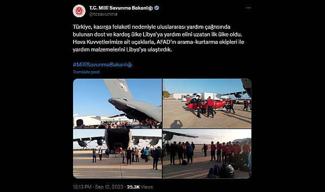 Milli Savunma Bakanlığı (MSB), Libya’nın doğusunda meydana gelen ve 3 binden fazla insanın hayatını kaybettiği selin ardından AFAD arama-kurtarma ekipleri ile yardım malzemelerini taşıyan uçağın Libya'ya ulaştığını açıkladı.MSB, Libya'nın doğusunda “Daniel” fırtınasının neden olduğu ve 3 binden fazla insanın yaşamını yitirdiği sel felaketinin ardından, arama kurtarma ekipleri ve yardım malzemelerini taşıyan uçağın Libya'ya ulaştığını duyurdu. MSB'den yapılan yazılı açıklamada, “Türkiye, kasırga felaketi nedeniyle uluslararası yardım çağrısında bulunan dost ve kardeş ülke Libya’ya yardım elini uzatan ilk ülke oldu. Hava Kuvvetlerimize ait uçaklarla, AFAD’ın arama-kurtarma ekipleri ile yardım malzemelerini Libya’ya ulaştırdık” denildi.NE OLMUŞTUOrta Akdeniz'de etkili olan “Daniel” fırtınası sonucunda Libya'nın Bingazi, Beyda, Merc, Suse ve Derne şehirlerinde sel meydana geldi. 3 binden fazla insan yaşamını yitirdi, binlerce kişi ise kayıp.