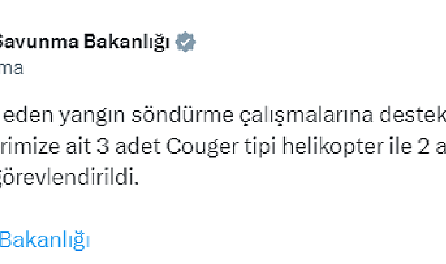 (ANKARA) - Milli Savunma Bakanlığı (MSB), İzmir'in Menderes ilçesine bağlı Karacadağ mevkiinde öğle saatlerinde çıkan orman yangını söndürme çalışmalarına destek için Türk Silahlı Kuvvetleri'ne ait 3 adet Couger tipi helikopter ile 2 adet CH-47 tipi helikopter görevlendirildiğini bildirdi.MSB resmi X hesabından yaptığı açıklamada, İzmir'in Menderes ilçesine bağlı Karacadağ mevkiinde öğle saatlerinde çıkan orman yangını söndürme çalışmalarına destek için Türk Silahlı Kuvvetleri'ne ait 3 adet Couger tipi helikopter ile 2 adet CH-47 tipi helikopter görevlendirildiği kaydedildi.