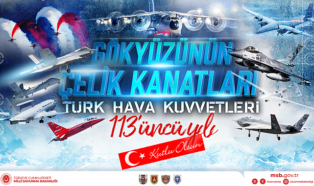 (ANKARA) - Milli Savunma Bakanlığı (MSB), Hava Kuvvetleri'nin kuruluşunun 113'üncü yıl dönümü dolayısıyla, "Türk Silahlı Kuvvetlerimizin gökyüzündeki çelik kanatları olan Hava Kuvvetlerimizin kuruluşunun 113’üncü yıl dönümü kutlu olsun" mesajını yayınladı.MSB'nin sosyal medya hesabından paylaşılan mesajda, "Türk Silahlı Kuvvetlerimizin gökyüzündeki çelik kanatları olan Hava Kuvvetlerimizin kuruluşunun 113’üncü yıl dönümü kutlu olsun! Ülkemiz ve milletimiz için çalışan kahraman ve fedakâr personelimize başarılı görevler diliyor, Başkomutanımız Gazi Mustafa Kemal Atatürk ile Milli Mücadele kahramanlarımızı, şehitlerimizi ve ebediyete intikal etmiş gazilerimizi rahmet ve minnetle anıyoruz" ifadelerine yer verildi.
