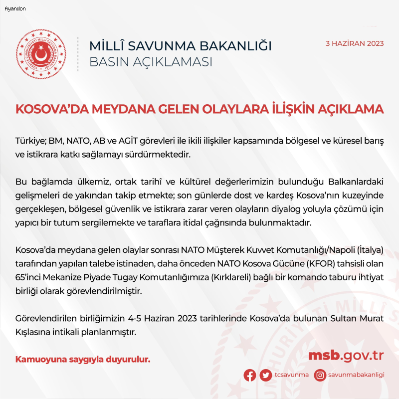 Milli Savunma Bakanlığı (MSB), “Kosova’da meydana gelen olaylar sonrası NATO Müşterek Kuvvet Komutanlığı/Napoli (İtalya) tarafından yapılan talebe istinaden, daha önceden NATO Kosova Gücüne (KFOR) tahsisli olan 65’inci Mekanize Piyade Tugay Komutanlığımıza (Kırklareli) bağlı bir komando taburu ihtiyat birliği olarak görevlendirilmiştir. Görevlendirilen birliğimizin 4-5 Haziran 2023 tarihlerinde Kosova’da bulunan Sultan Murat Kışlasına intikali planlanmıştır” açıklamasını yaptı.MSB, Sırbistan ve Kosova arasındaki gerginlik üzerine NATO’nun talebi üzerine Kosova’ya bir komando taburu gönderileceğini duyurdu. MSB’den bugün yapılan yazılı açıklama şöyle:“Türkiye; BM, NATO, AB ve AGİT görevleri ile ikili ilişkiler kapsamında bölgesel ve küresel barış ve istikrara katkı sağlamayı sürdürmektedir. Bu bağlamda ülkemiz, ortak tarihî ve kültürel değerlerimizin bulunduğu Balkanlardaki gelişmeleri de yakından takip etmekte; son günlerde dost ve kardeş Kosova’nın kuzeyinde gerçekleşen, bölgesel güvenlik ve istikrara zarar veren olayların diyalog yoluyla çözümü için yapıcı bir tutum sergilemekte ve taraflara itidal çağrısında bulunmaktadır.Kosova’da meydana gelen olaylar sonrası NATO Müşterek Kuvvet Komutanlığı/Napoli (İtalya) tarafından yapılan talebe istinaden, daha önceden NATO Kosova Gücüne (KFOR) tahsisli olan 65’inci Mekanize Piyade Tugay Komutanlığımıza (Kırklareli) bağlı bir komando taburu ihtiyat birliği olarak görevlendirilmiştir. Görevlendirilen birliğimizin 4-5 Haziran 2023 tarihlerinde Kosova’da bulunan Sultan Murat Kışlasına intikali planlanmıştır.”
