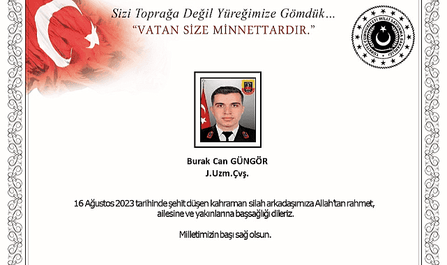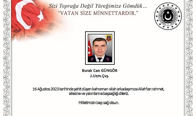 Milli Savunma Bakanlığı (MSB), jandarma uzman çavuş Burak Can Güngör’ün dün şehit olduğunu duyurdu. MSB, jandarma uzman çavuş Burak Can Güngör’ün dün şehit olduğunu duyurdu. Bakanlığın sosyal medya hesabından yaptığı paylaşım şöyle: “16 Ağustos 2023 tarihinde şehit düşen kahraman silah arkadaşımıza Allah’tan rahmet, ailesine ve yakınlarına başsağlığı dileriz. Milletimizin başı sağ olsun.”