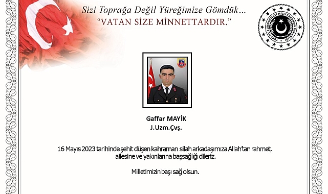 Milli Savunma Bakanlığı (MSB), Jandarma Uzman Çavuş Gaffar Mayik’in şehit olduğunu duyurdu.MSB'nin sosyal medya hesabında bugün yapılan açıklamada, Jandarma Uzman Çavuş Gaffar Mayik’in dün şehit olduğu bildirildi. Açıklamada, “16 Mayıs 2023 tarihinde şehit düşen kahraman silah arkadaşımıza Allah’tan rahmet, ailesine ve yakınlarına başsağlığı dileriz. Milletimizin başı sağ olsun” denildi.
