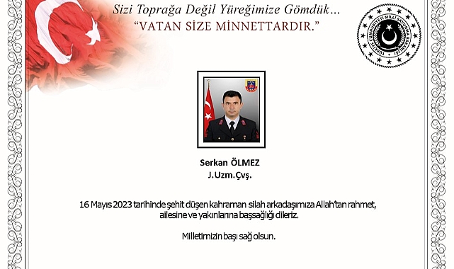 Milli Savunma Bakanlığı (MSB), Jandarma Uzman Çavuş Serkan Ölmez’in şehit olduğunu duyurdu.MSB, sosyal medya hesabında bugün yaptığı açıklamada, Jandarma Uzman Çavuş Serkan Ölmez’in dün şehit olduğu bildirildi. Açıklamada, “16 Mayıs 2023 tarihinde şehit düşen kahraman silah arkadaşımıza Allah’tan rahmet, ailesine ve yakınlarına başsağlığı dileriz. Milletimizin başı sağ olsun” denildi.